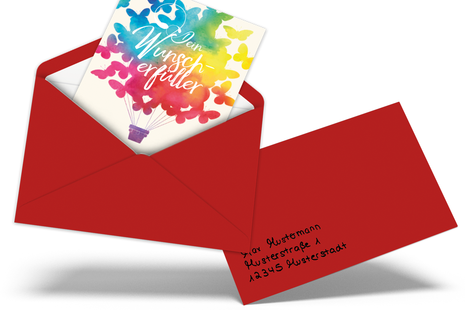 Mache deinen WUNSCHGUTSCHEIN noch einzigartiger indem Du ihn in einem hochwertigen roten Geschenkumschlag verpacken lässt. Wenn wir deinen WUNSCHGUTSCHEIN direkt an den Beschenkten verschicken sollen, wird der Geschenkumschlag handschriftlich adressiert.