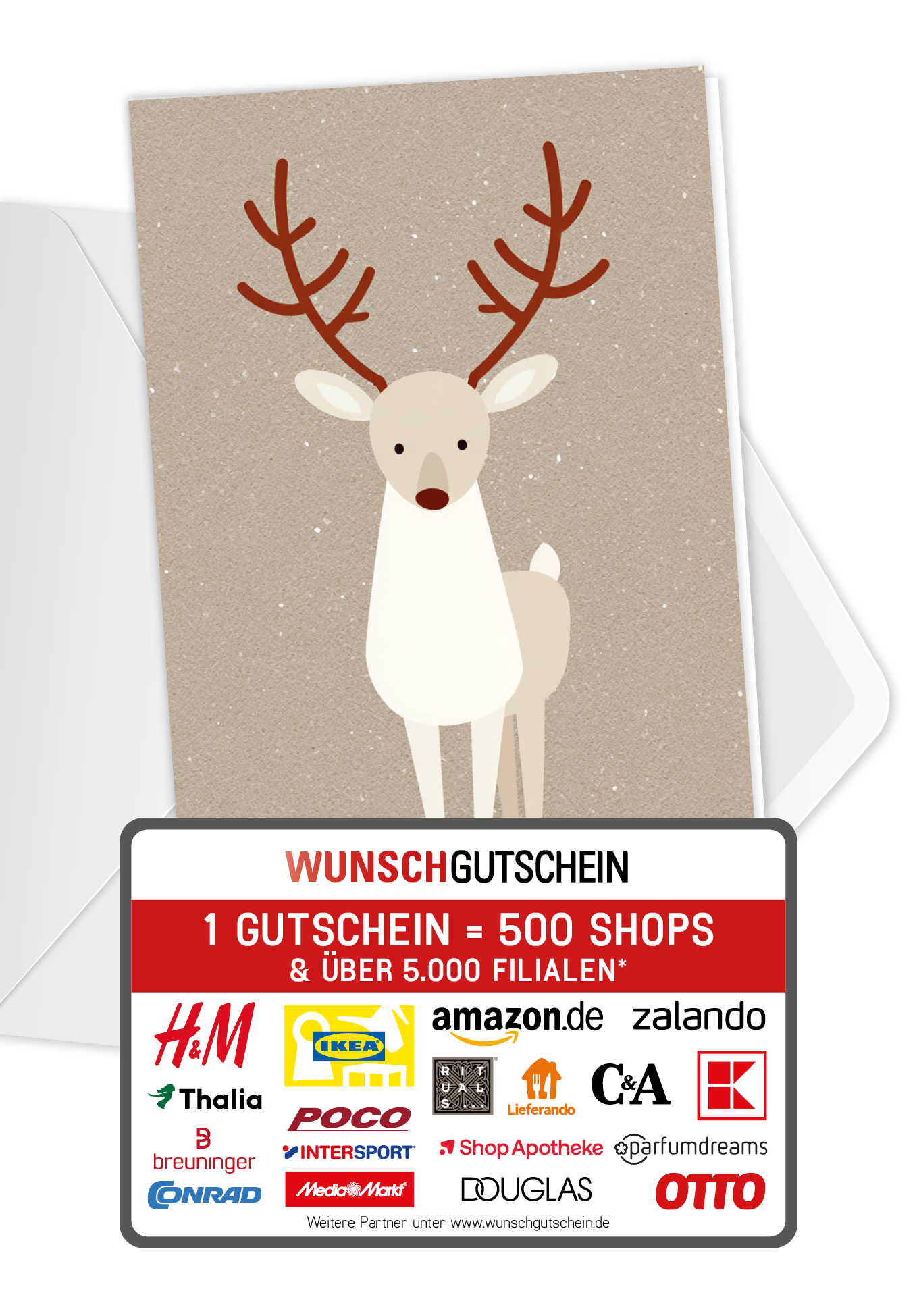 WUNSCHGUTSCHEIN ist das perfekte Geschenk: Verschenke den Gutschein, der in über 500 Partnergutscheine einlösbar ist – Von A wie Amazon bis Z wie Zalando.* Du liegst mit deinem Geschenk also immer richtig! WUNSCHGUTSCHEIN ist in den Wertstufen 15, 20, 25, 30, 40, 50, 75, 100, 150 und 200 Euro erhältlich. Es gelten die Gutscheinbedingungen für den WUNSCHGUTSCHEIN.