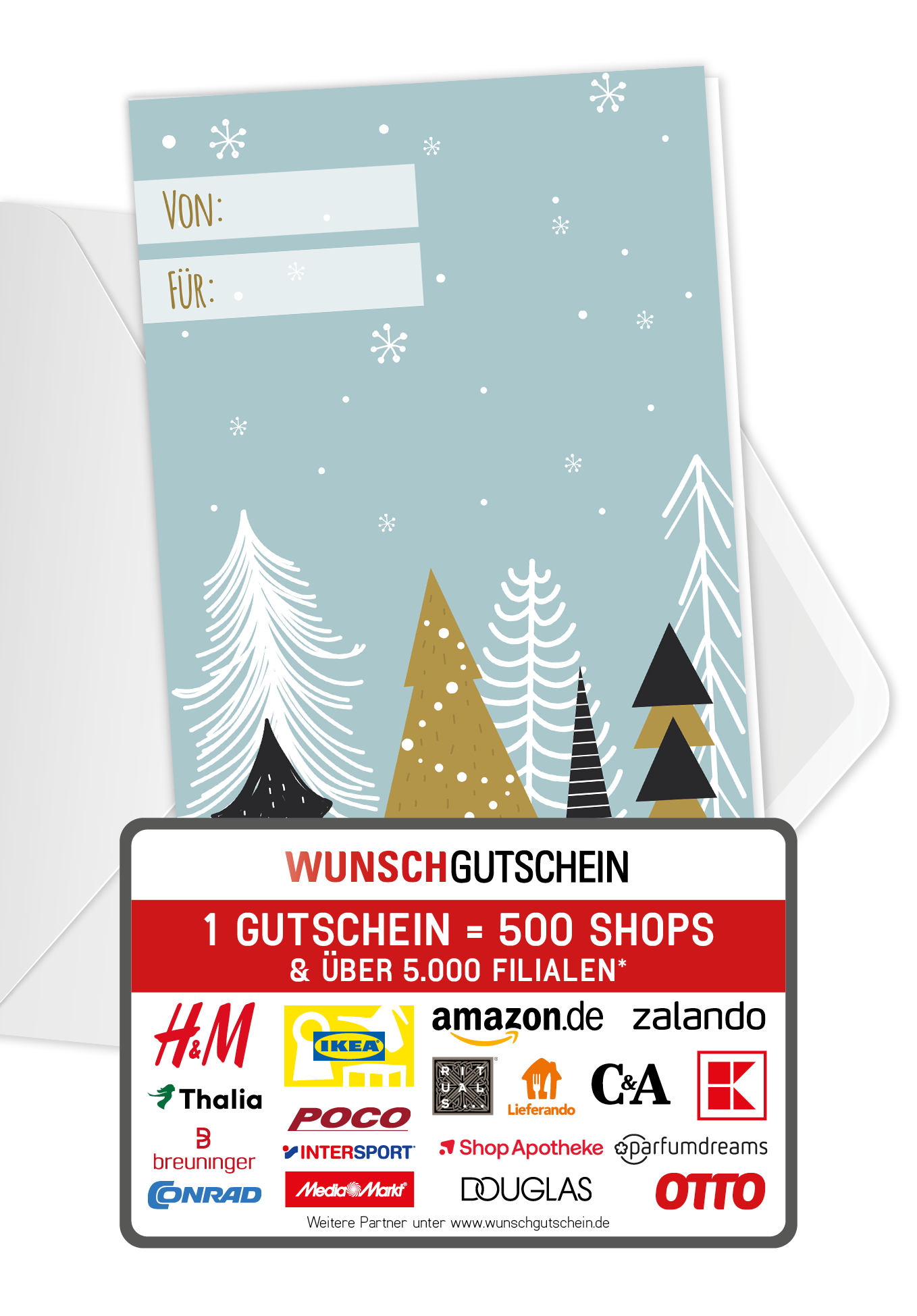 WUNSCHGUTSCHEIN ist das perfekte Geschenk: Verschenke den Gutschein, der in über 500 Partnergutscheine einlösbar ist – Von A wie Amazon bis Z wie Zalando.* Du liegst mit deinem Geschenk also immer richtig! WUNSCHGUTSCHEIN ist in den Wertstufen 15, 20, 25, 30, 40, 50, 75, 100, 150 und 200 Euro erhältlich. Es gelten die Gutscheinbedingungen für den WUNSCHGUTSCHEIN.